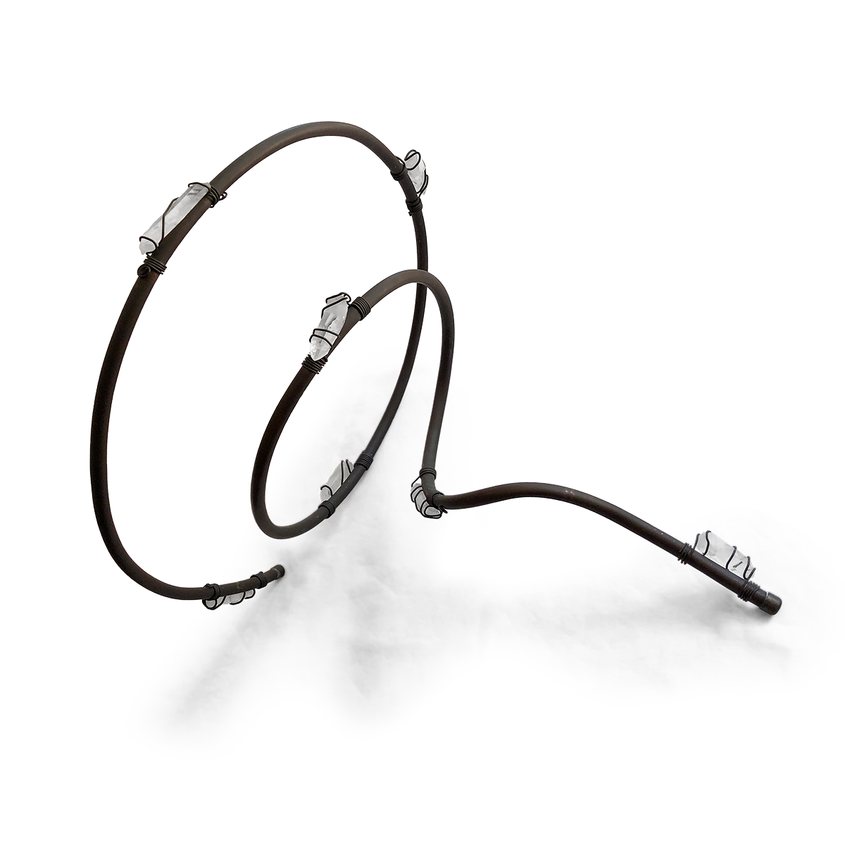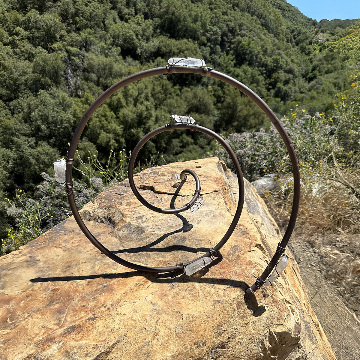 One of the largest in the standard design Bio-Vortex line, measuring approximately 20-22" in diameter and approx. 22-24" in depth, constructed with 1/2" copper tubing, seven quartz crystals wire wrapped to exterior, whole mini quartz crystals contained within, filled with energized water, and influences a 140' area in all directions. Ordered with Noble Shungite, the device will additionally have shungite exteriorly mounted and contain Noble Shungite within. This device is perfect for placement in homes, businesses, schools, farms, gardens. barns, orchards, hung from trees and ceilings, in meditation spaces, and used in food storage facilities and any other places where fresh produce, grains, beans, processed livestock and/or seafood is stored or processed.